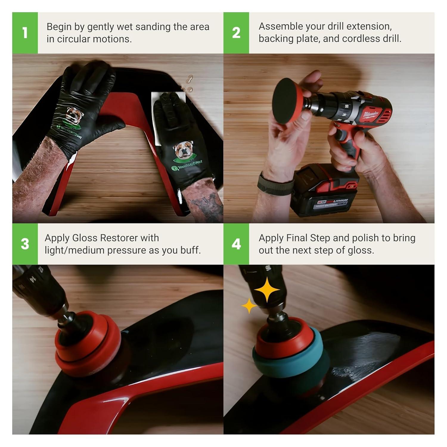EVERYTHING YOU NEED IN ONE KIT – Includes Sanding Pad, 2 grades of Polishing Pads, Gloss Restorer, Final Step, drill extension and backing plate, Microfiber Cloth, and Instructions. DOES NOT INCLUDE DRILL.